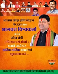 भाजपा की डबल इंजन की सरकार के सभी मुख्य घोषणाओं का जनजागरूकता से लेकर उचित प्रचार प्रसार कर जनकल्याण के नए दिशा में लोगो को लेजाना, मुख्य सभी कार्य हेतु छत्तीसगढ़ के हृदय स्थल कोरबा में कार्यकर्ताओं द्वारा अतिहर्षोउल्लास से विश्वकर्मा जी को शुभकामनाएं भेजी जारही है।