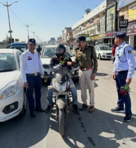 यातायात नियमों को पालन करने वालों को भेंट किया गुलाब, यातायात सुरक्षा माह के तहत चलाया गया जागरूकता अभियान